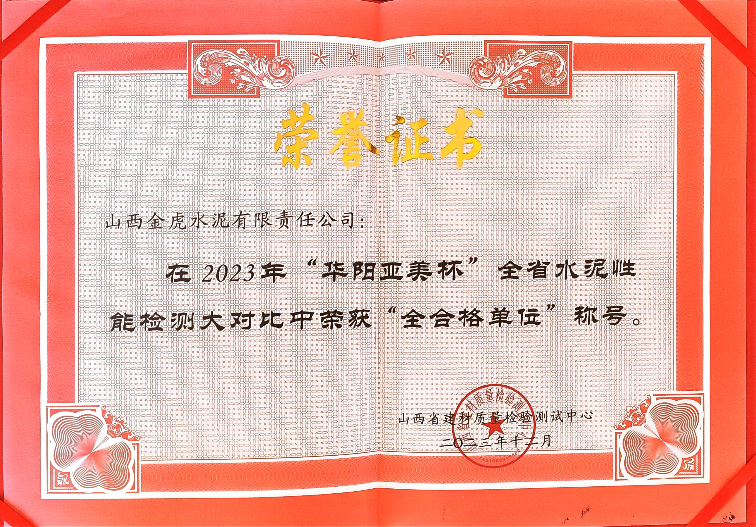 我公司榮獲山西省水泥檢驗(yàn)大對(duì)比“全合格”稱號(hào)